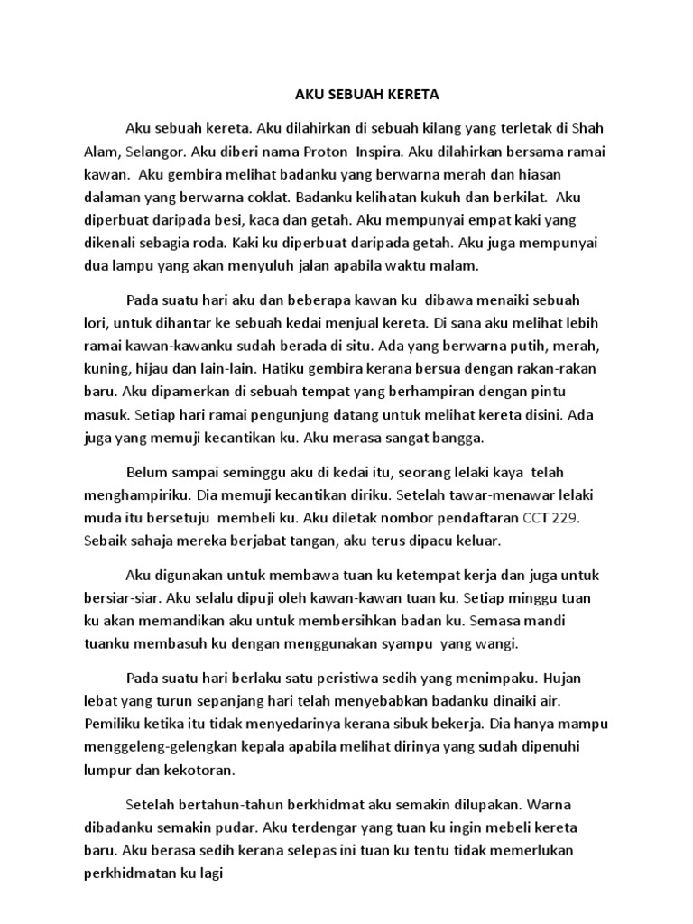Contoh Karangan Aku Sebuah Kereta : Aku dilahirkan di kilang proton di shah alam.. By guru rizalposted on march 27, 2021. Aku dilahirkan di sebuah kilang yang terkenal di iceland.nama aku ialah lamborghini gallardo.aku dilahirkan bersama ramai kawan.badanku berwarna kuning.badanku dibuat daripada besi dan keluli.selepas dibuat aku dinilai dari segi kualiti. Pada suatu hari, aku telah dihantar ke sebuah kedai basikal di petaling jaya aku tidak secantik dulu lagi. Karangan narasi disajikan dengan maksud agar dapat memberikan arti tentang serentetan kejadian yang terjadi sehingga para pembaca bisa memetik hikmah dari karangan narasi mempunyai tiga unsur pokok utama, yaitu tokoh, kejadian, dan konflik. Impian untuk menjadi individu kebanggaan keluarga.