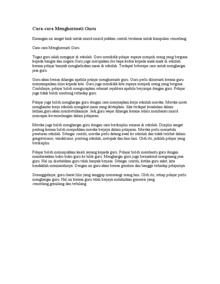 Selain itu, kerangka karangan juga berfungsi 1. Tindakan tersebut adalah bentuk komunikasi nonlisan yang dapat membangun hubungan yang kokoh antara orang yang saling menghargai. Mereka ibarat lilin yang membakar diri demi memberikan didikan terbaik kepada pelajar. Terdapat beberapa cara yang boleh dilakukan untuk menghargai. Guru ialah insan mulia yang mengajar dan mendidik kita tanpa mengira masa , tenaga serta wang ringgit.