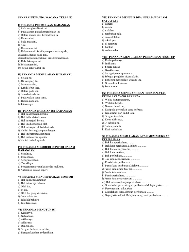 2) dalam huraian isi, penanda wacana dan pola perlu diberikan. You can do the exercises online or download the worksheet as pdf. Penanda kohesi pada wacana commit to user iii penanda kohesi pada wacana rubrik 68$5$0$+$6,6:$ dalam harian joglo semar disusun oleh tiara perdana putri c0206051 telah. Penanda wacana untuk memulakan ayat pendahuluan karangan. In this video, i will show a list of penanda wacana that can be used in your karangan or ulasan. Kegagalan dalam penggunaan penanda wacana yang tepat akan menyebabkan seluruh wacana tidak mempunyai kesatuan dan perpautan yang lengkap. Menunjukkan pertautan dari segi kronologi ii. Pada zaman pascakemerdekaan ini, c. · oleh itu, kebaikan dan keburukan yang mewarnai fokus perbincangan akan dihuraikan dengan terperinci demi kebaikan bersama. Penanda wacana untuk kesmpulan karangan. Banyak sekali hal yang harus dilakukan sebelum sebuah konten berkualitas dapat tercipta, seperti yang sudah pernah dibahas di dalam panduan belajar blog marketing. Kohesi dalam wacana diartikan sebagai kepaduan. Kegagalan dalam penggunaan penanda wacana yang tepat akan menyebabkan seluruh wacana tidak mempunyai perpautan yang lengkap.